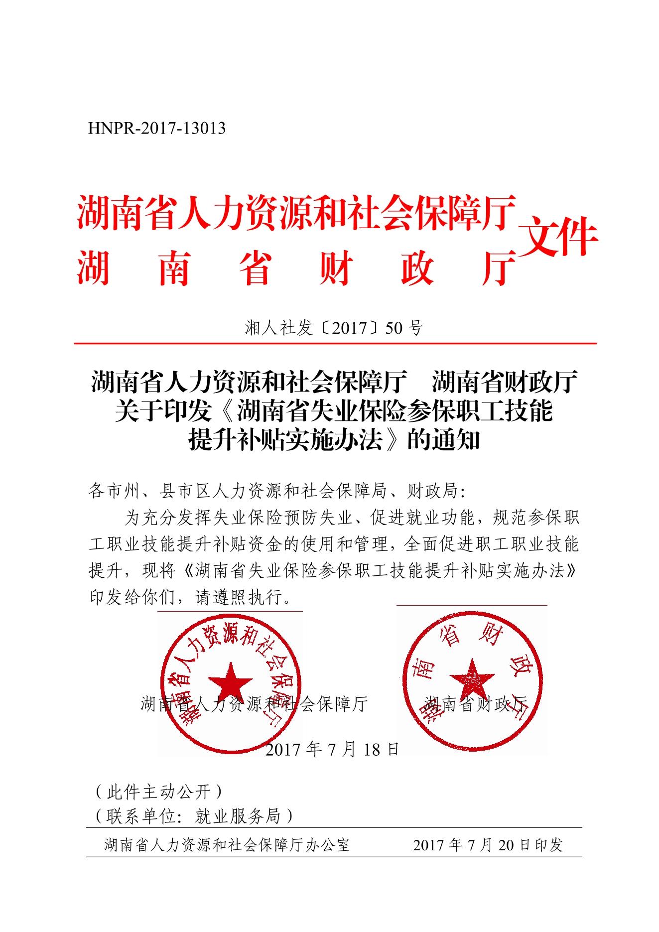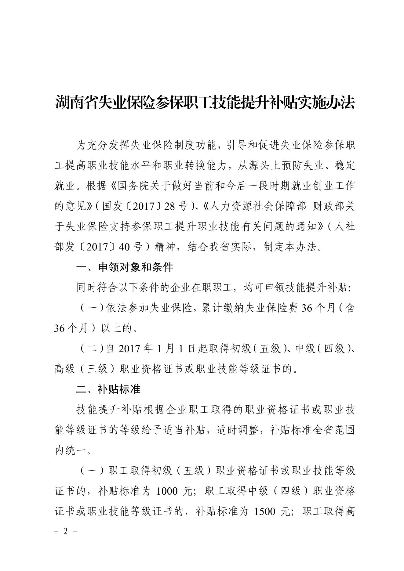 湖南省人力资源和社会保障厅 湖南省财政厅 关于印发《湖南省失业保险参保职工技能提升补贴实施办法》的通知